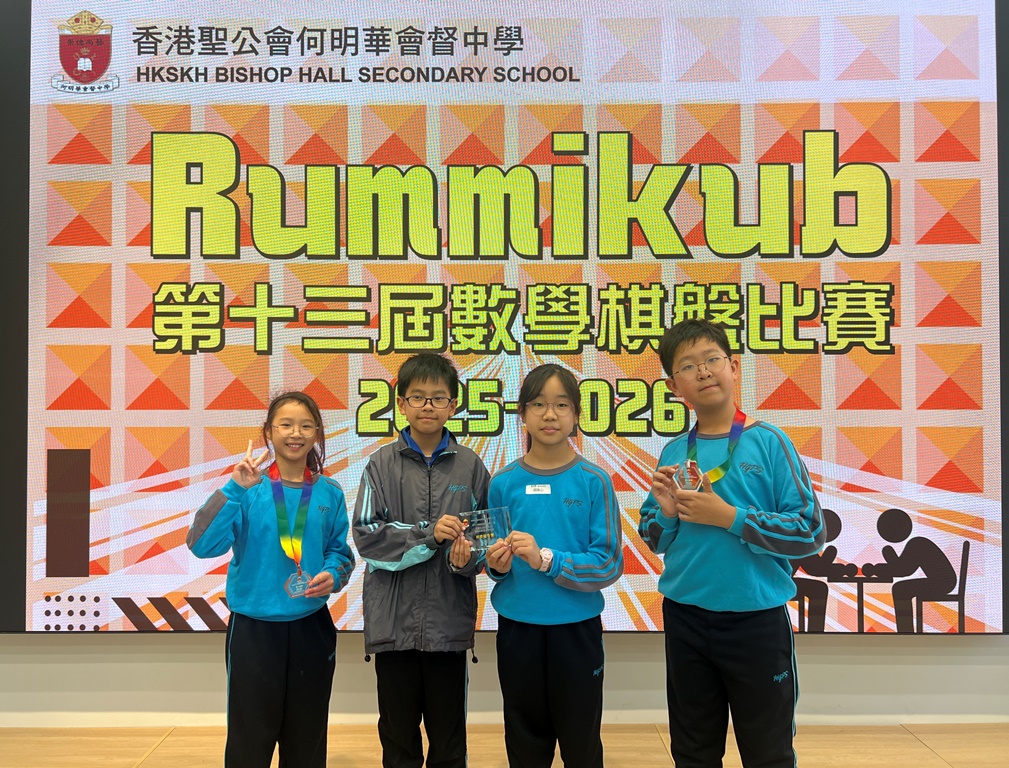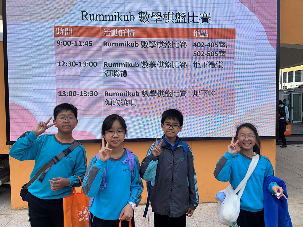 四位五至六年級同學代表學校參加了由香港聖公會何明華會督中學舉辦的「第十三屆小學數學棋盤比賽暨全港Rummikub聯校小學邀請賽(初賽)」。在是次比賽中,6B班梁穎晞同學獲得個人銀獎、5A班張茵同學獲得個人銅獎,他們連同5A班張詠心及丁鴻鈞同學更為學校獲得了團體優等獎。