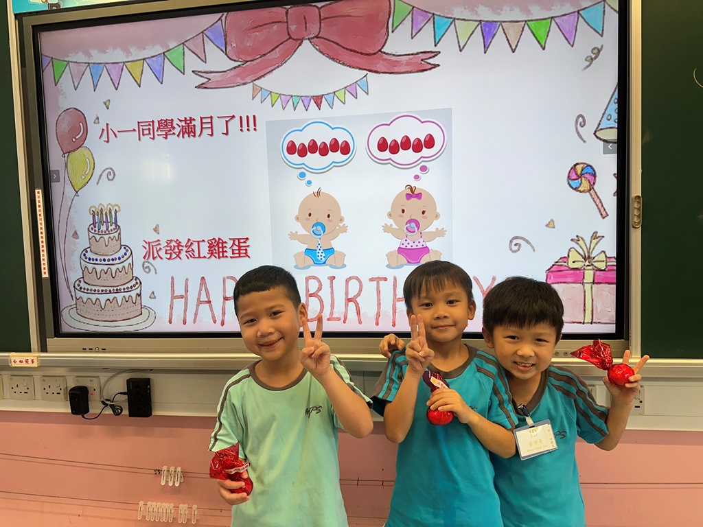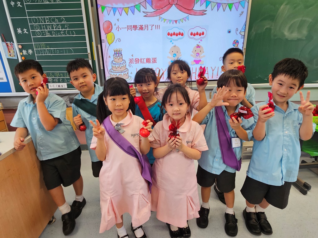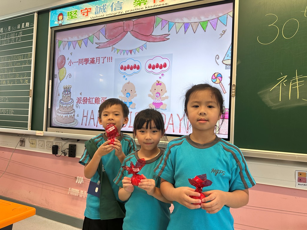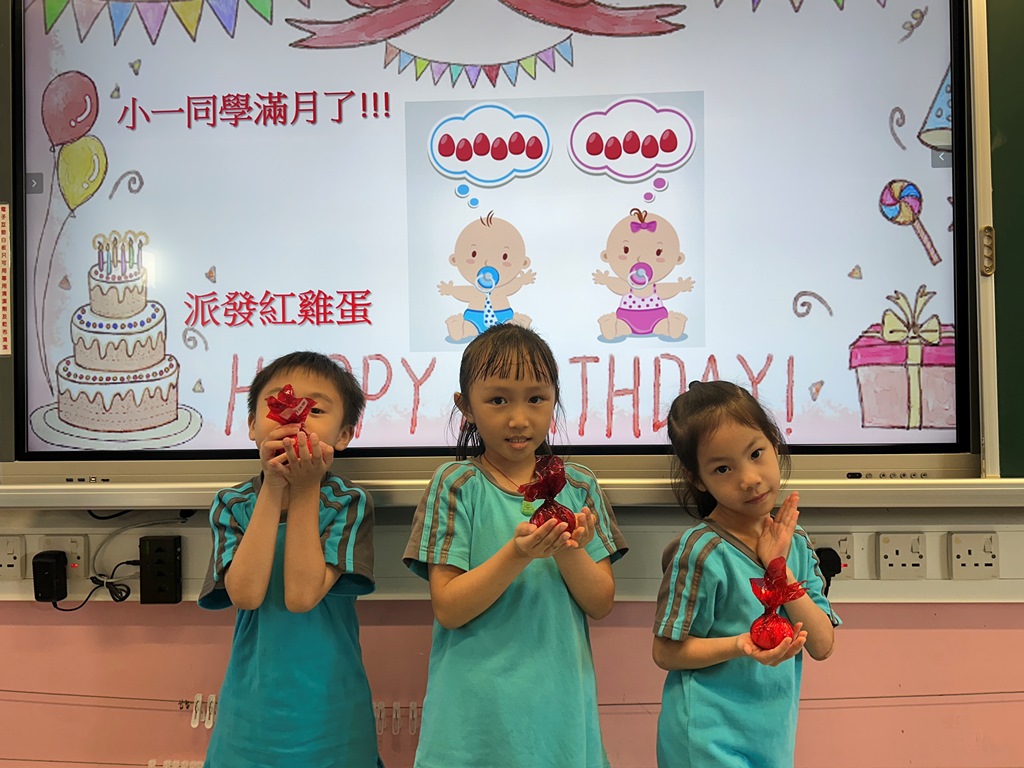 小一同學們在堅樂小學已經一個月,看見小一同學們不論在學習、自理方面都有所成長,並且透入校園生活。本校特別舉辦「小一滿月禮」,送贈紅雞蛋祝賀每位小一同學。祝福他們健康成長,快樂地享受校園生活。