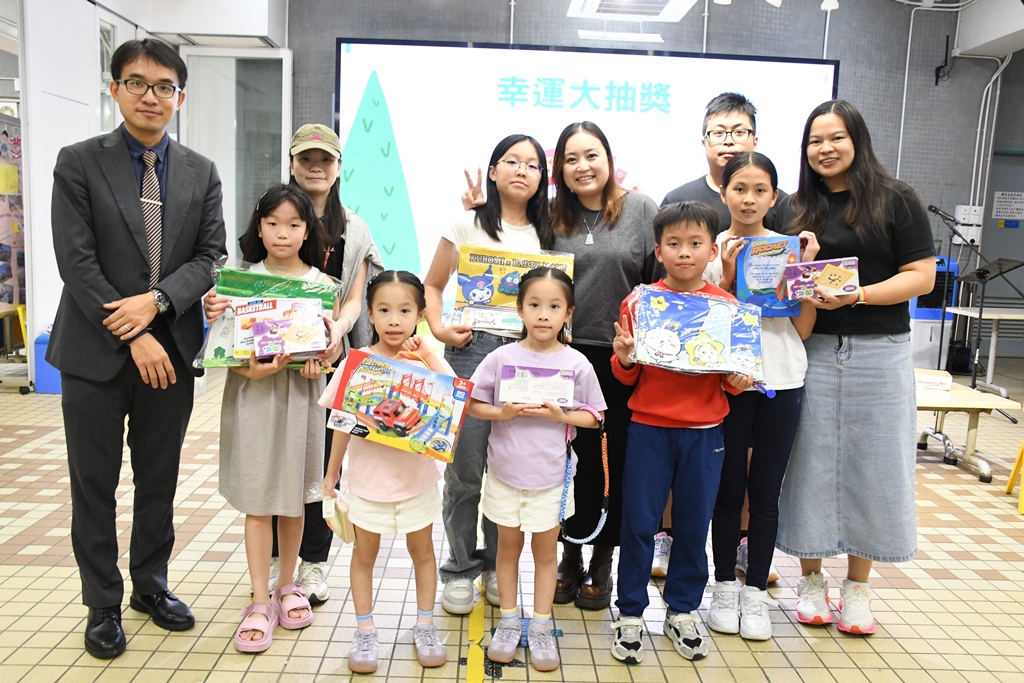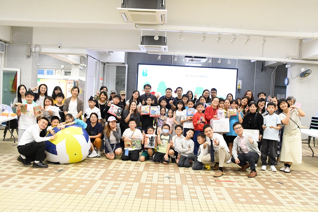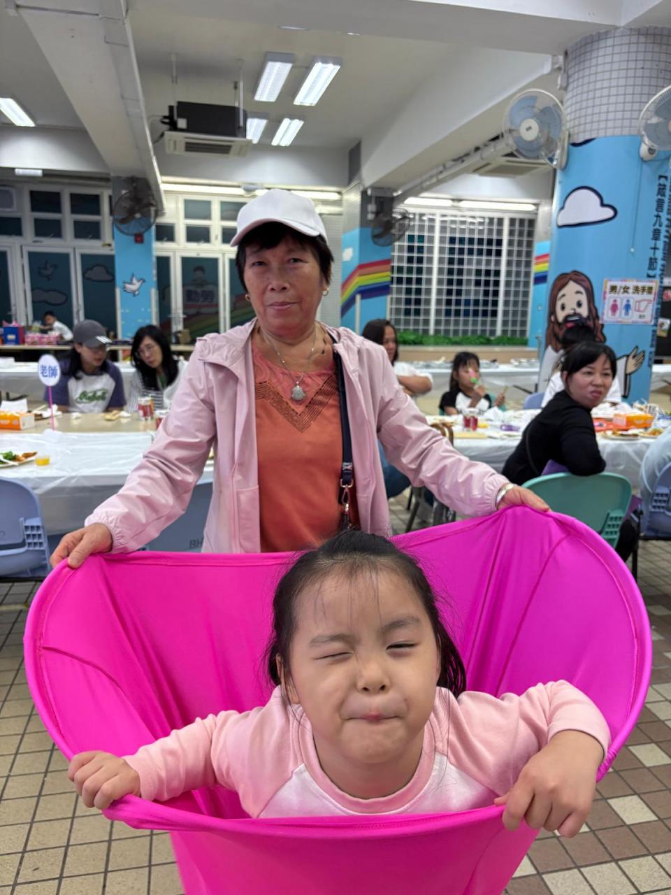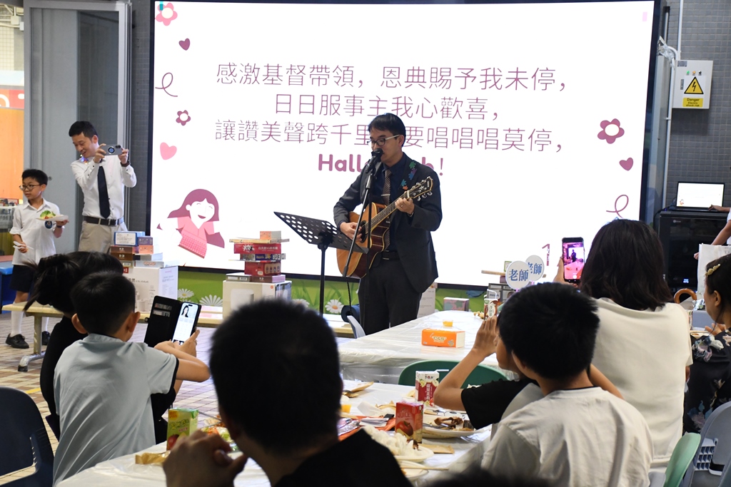 施校長結他伴奏唱詩歌,全場揮動閃光玩具,氣氛熱烈。高潮設「最温馨家庭合照」比賽,全體投票選出動人時刻。小朋友草地嬉戲,盡顯歡樂。