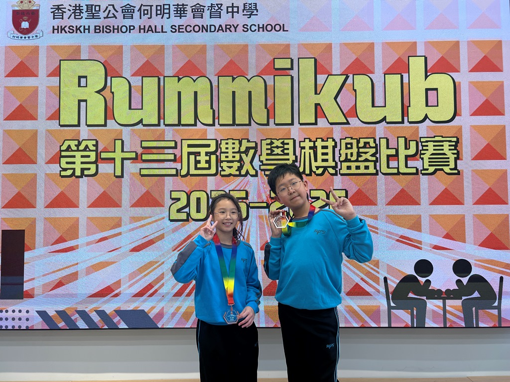 四位五至六年級同學代表學校參加了由香港聖公會何明華會督中學舉辦的「第十三屆小學數學棋盤比賽暨全港Rummikub聯校小學邀請賽(初賽)」。在是次比賽中,6B班梁穎晞同學獲得個人銀獎、5A班張茵同學獲得個人銅獎,他們連同5A班張詠心及丁鴻鈞同學更為學校獲得了團體優等獎。