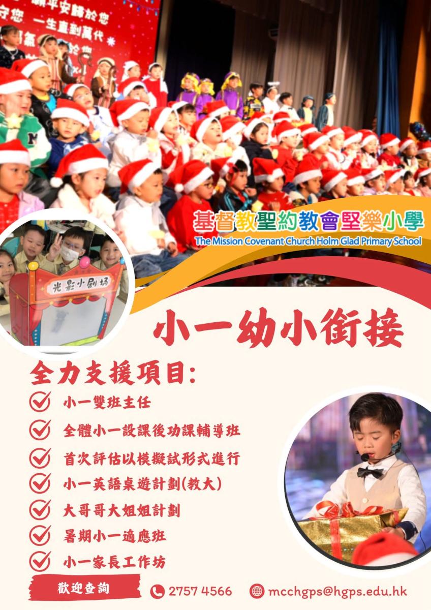 小一雙班主任 一年級每班都有雙班主任,以加強照顧學生和支援家長,並配合融合教育的需要,同時安排教學助理進入課室支援個別學生。 全體小一設課後功課輔導班 為所有小一學生在放學後安排功課輔導班,希望更有效地照顧學生的需要。 升小Power Up 讓幼稚園學生早一步了解小學校園生活,親身體驗多元化的課堂活動。 小一迎新家長會及新生家長會 讓家長認識子女的學習生活和家長支援網絡、邀請講者分享家長教育,協助家長調節及預備升小事情,並與班主任有緊密的溝通。 |