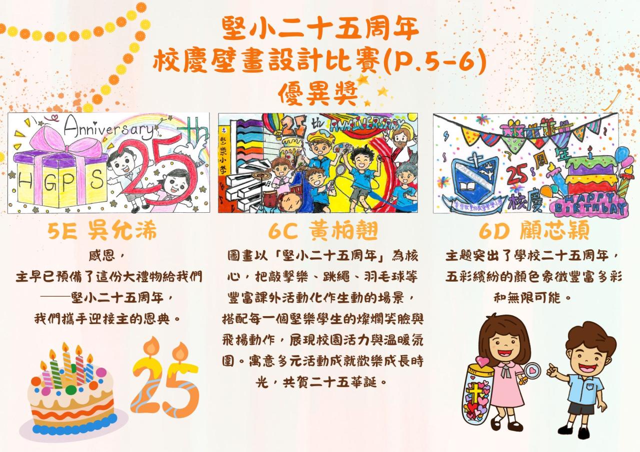 今年是本校25周年校慶,有見及此,學校於9月舉行三個不同的校慶設計比賽。感謝參加比賽的家長和同學,每一份參賽作品都是送給學校的校慶賀禮。以下是各比賽中獲得冠、亞、季及優異獎的作品,恭喜所有獲獎的同學!