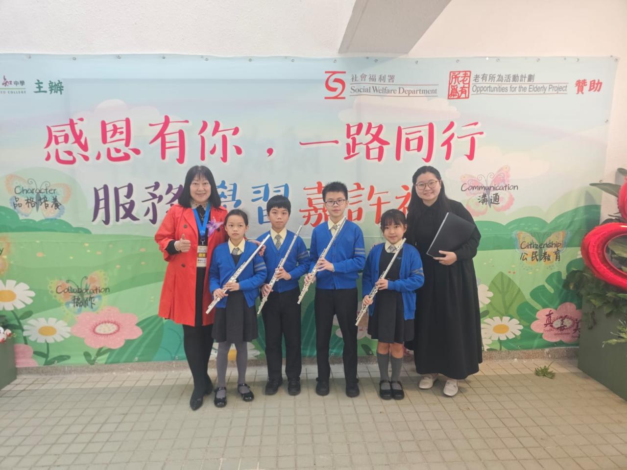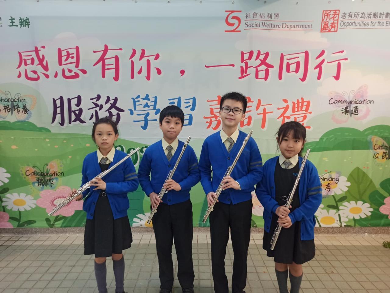 本校長笛合奏小組受邀參加萬鈞匯知中學「感恩有你,一路同行——服務學習嘉許禮」並作表演嘉賓。四位同學以長笛吹奏古典作曲家韋瓦第《四季》中的《春》,由老師鋼琴伴奏,共同演奏出美妙樂章。同學們在台上都表演得十分投入,在台下又能聆聽中學生服務學習的分享,實在是一次難忘又有收穫的經歷!