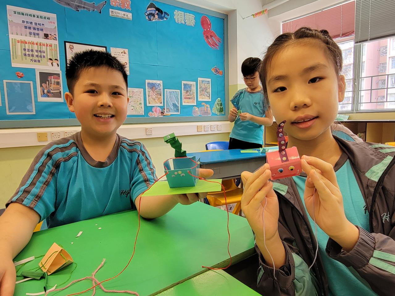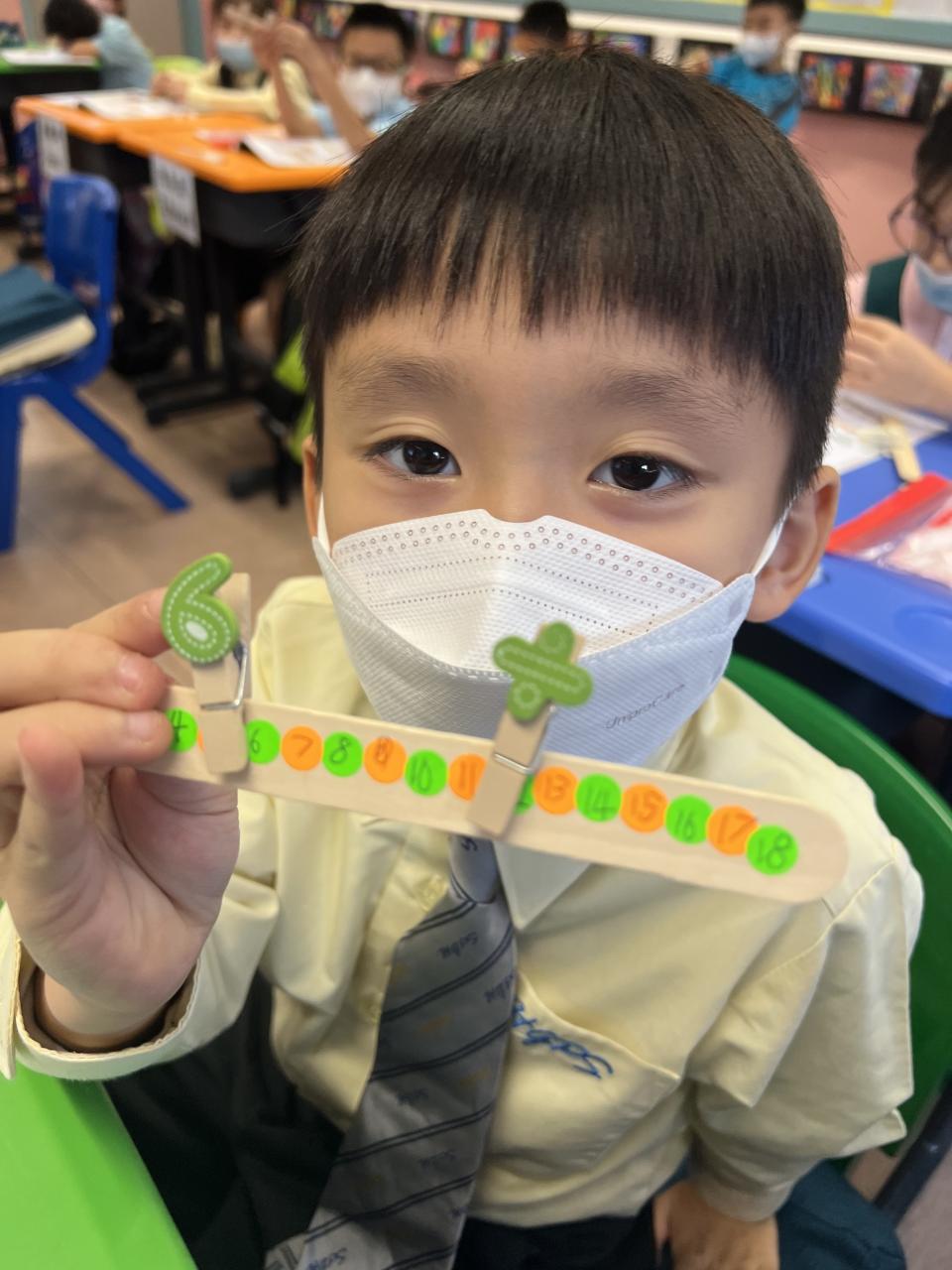 在課堂內,教導學生使用數概工具學習,把數學概念植入學習工具中,透過多感觀的策略,如圖像、動手作,加強學生對數學概念的掌握,從而幫助學生鞏固數學根基,以及協助他們達至更深的學習層次。模型解題法(Model Method)是其中一個數概工具,在校本課程中,我們把文字應用題中的重要資料以圖像表達,建立學生運用圖像思維理解數量關係的能力,並以此成為其中一個解難的工具。